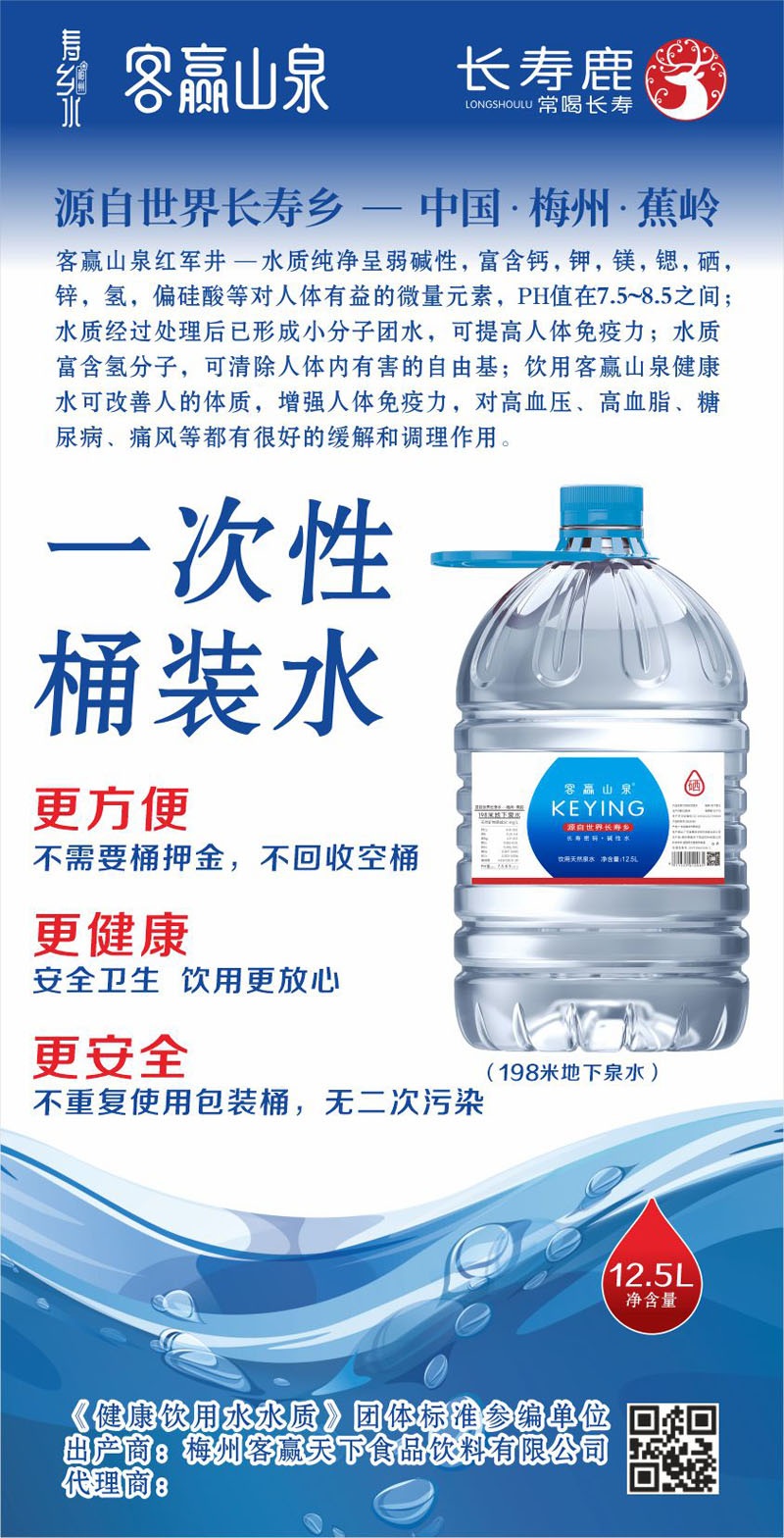 梅州客贏天下長壽水業有限公司是一家生產弱堿性天然飲用水的企業,位于第七個世界長壽鄉--蕉嶺華僑農場北坑村五馬山,水源天然純凈含多種礦物質微量元素,是健康的好水。現為珠海各機關單位、協會、商會、企業單位舉辦高端會議及活動送上一份真誠的祝福和溫馨的問候。